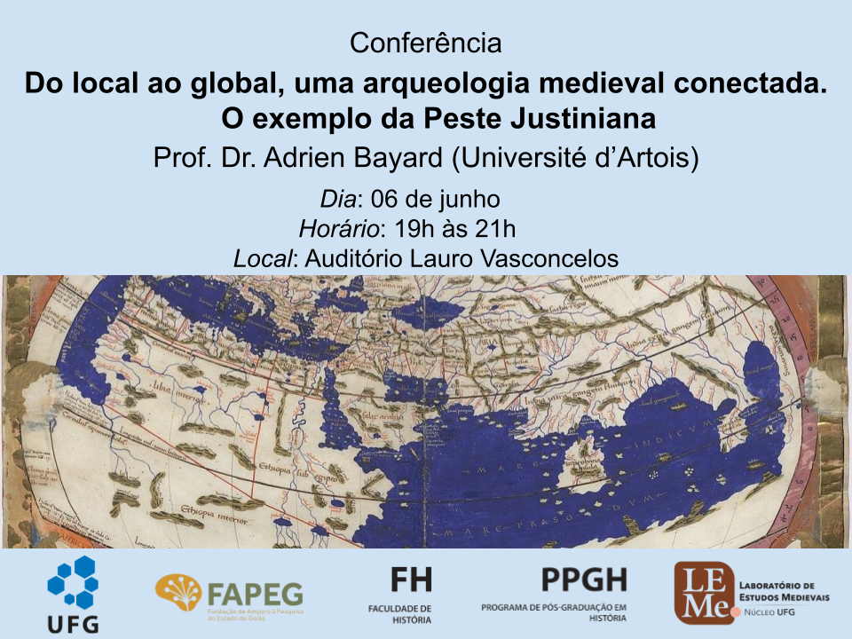 O Programa de Pós-Graduação da Faculdade de História convida toda a comunidade para a Conferência Do local ao global, uma arqueologia medieval conectada. O exemplo da Peste Justiniana ministrada pelo professor Dr. Adrien Bayard (Université d'Artois/França).