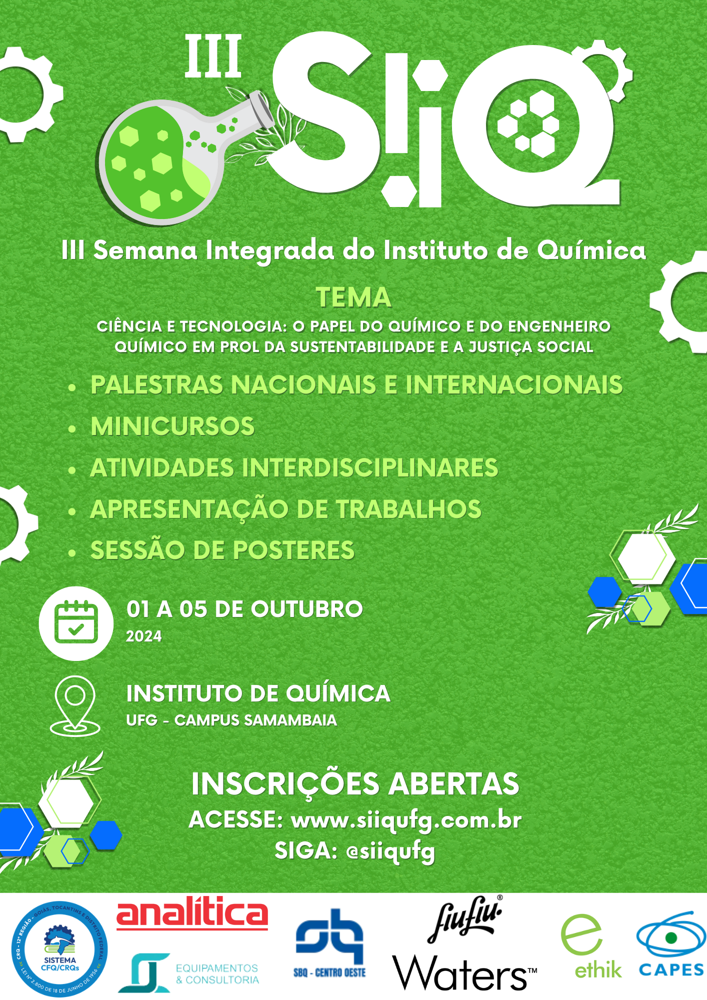 A III Semana Integrada do Instituto de Química (SIIQ), é a terceira edição de um evento que unifica 4 entidades do Instituto de Química da UFG: Graduação em Química (bacharelado e licenciatura), Graduação em Engenharia Química, Pós-Graduação em Química e Pós-Graduação em Engenharia Química. Este evento almeja reunir todos os eventos de divulgação cientifica que tradicionalmente são realizados no Instituto de Química da Universidade Federal de Goiás. O evento congrega a Semana da Química e Semana da Engenharia Química realizadas pelos estudantes do curso e organizado pelo Centro Acadêmico da Química, Centro Acadêmico da Engenharia Química juntamente com a coordenação dos cursos de Bacharelado e Licenciatura em Química e coordenação do curso de Engenharia Química. Além destes dois eventos tradicionais, a Semana Integrada de 2024, terá adicionalmente o Workshop da Pós-Graduação em Química, evento bianual que busca estimular a divulgação científica dos pesquisadores do IQ-UFG e proporcionar um ambiente de atualização e de desenvolvimento crítico acerca da pesquisa nacional.