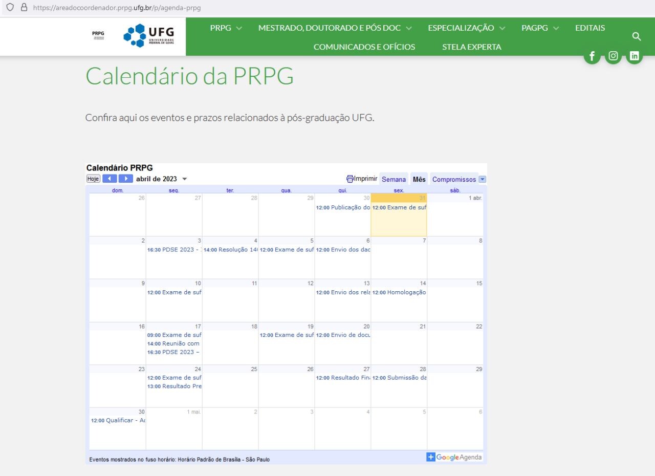 A Pró-Reitoria de Pós-Graduação disponibilizou no mês de abril, no site Área do Coordenador, a página "Calendário da PRPG". O objetivo da página é mostrar, no formato de uma agenda, todos os prazos a serem observados pelos gestores da pós-graduação na UFG. A iniciativa visa auxiliar esse público quanto ao cumprimento do cronograma de reuniões, eventos e demais atividades comunicadas via SEI/UFG e WhatsApp.